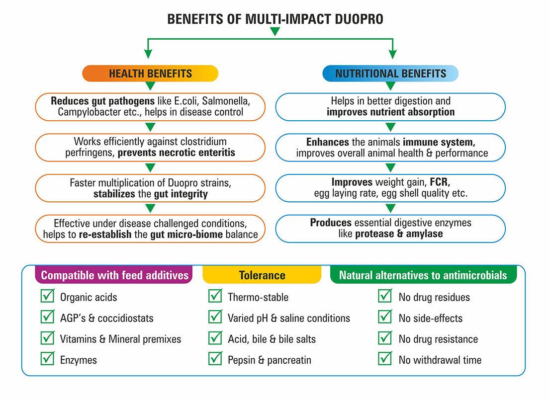 - DuoPro performs a dual role of lowering the pathogen proliferation and optimizing the animal performance leading to lesser mortality & higher profitability.